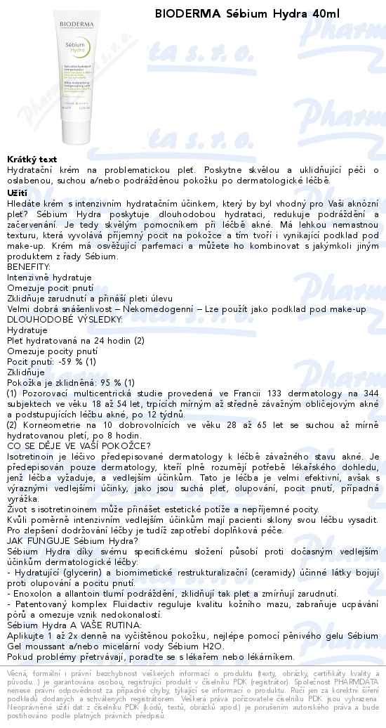 Bioderma Sébium Hydra je hydratační krém na komplementární péči pro anti-aknózní léčbu, která vede k vysušování kůže a lokálním podrážděním. Poskytuje dlouhotrvající zvlhčení díky rezervoárnímu účinku. Kompenzuje slupování a napětí v ošetřované kůži.
