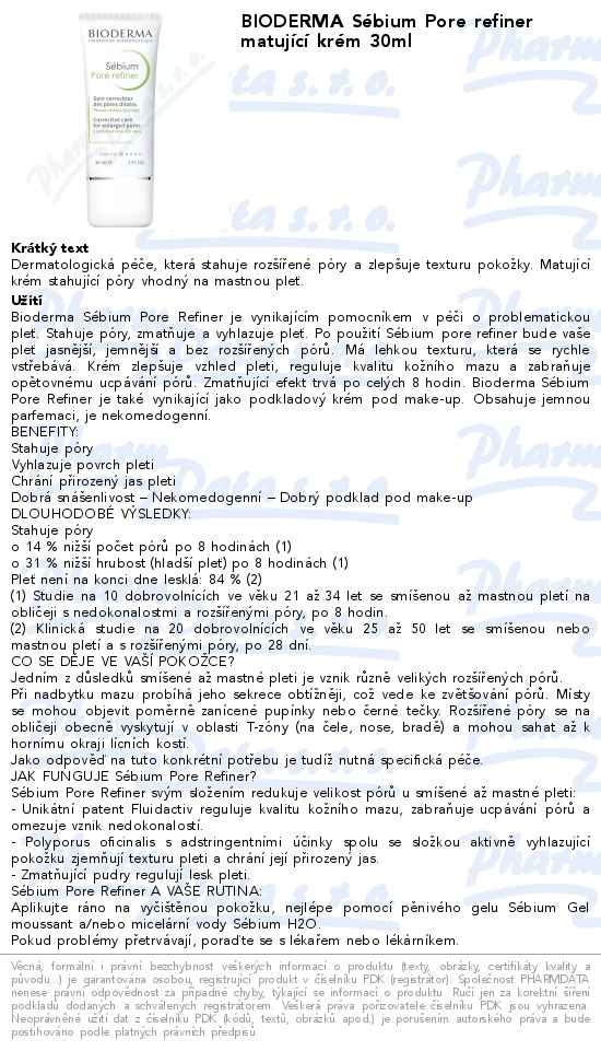 Bioderma Sébium Pore Refiner je aktivní sérum, které okamžitě stahuje kožní póry, ty se stávají méně viditelné. Zlepšuje vzhled pokožky a její čistotu. Patentovaný komplex Fluidactiv zároveň ovlivňuje tvorbu kožního mazu a tím zabraňuje ucpávání pórů. Účinné látky Sébium Pore Refiner čistí pokožku a antioxidanty zachovávají její přirozený lesk. Lehká gelovo krémová struktura se snadno roztírá a na pokožce zanechává příjemný pocit. Je vhodný i jako podklad pro make-up.