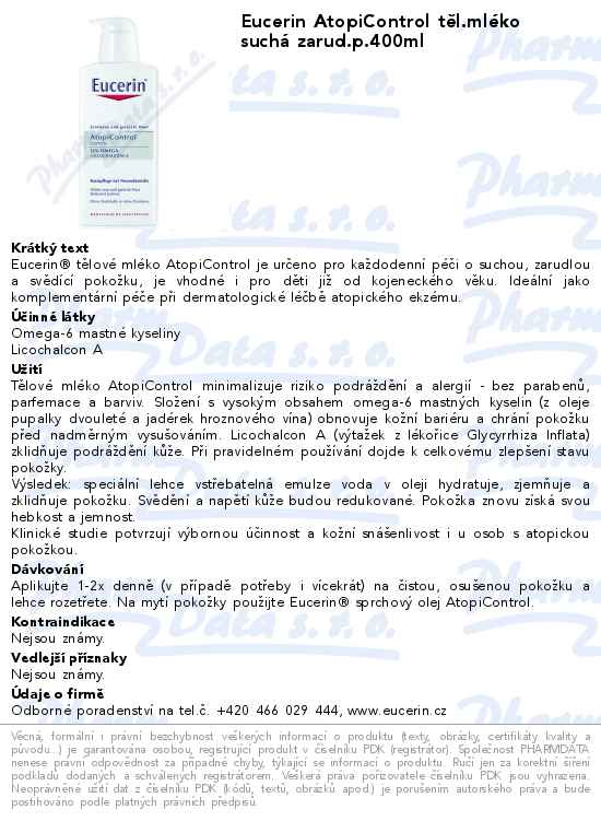 EUCERIN Eucerin tělové mléko AtopiControl je určeno pro každodenní péči o suchou, zarudlou a svědící pokožku, je vhodné i pro děti již od kojeneckého věku. Ideální jako komplementární péče při dermatologické léčbě atopického ekzému.